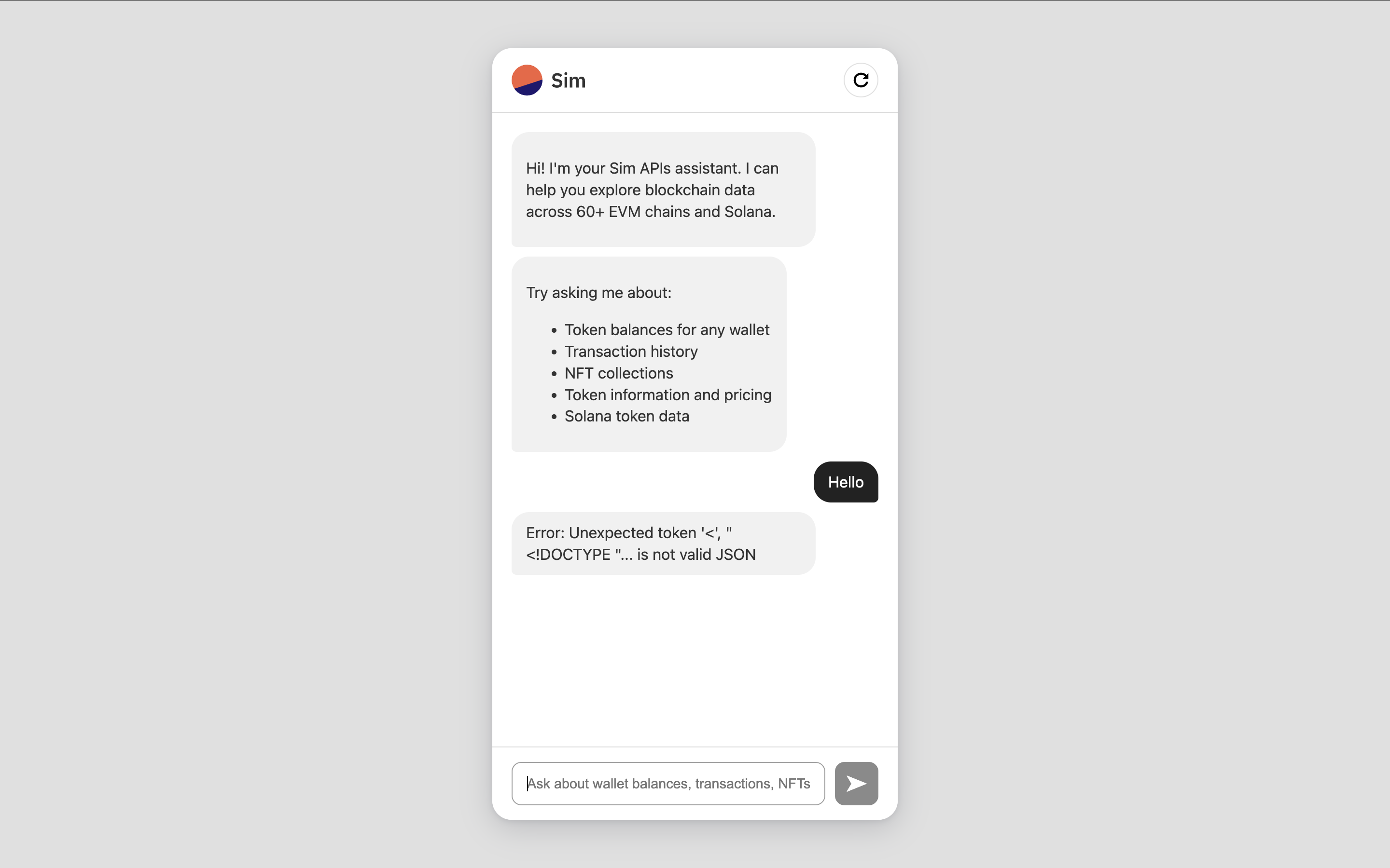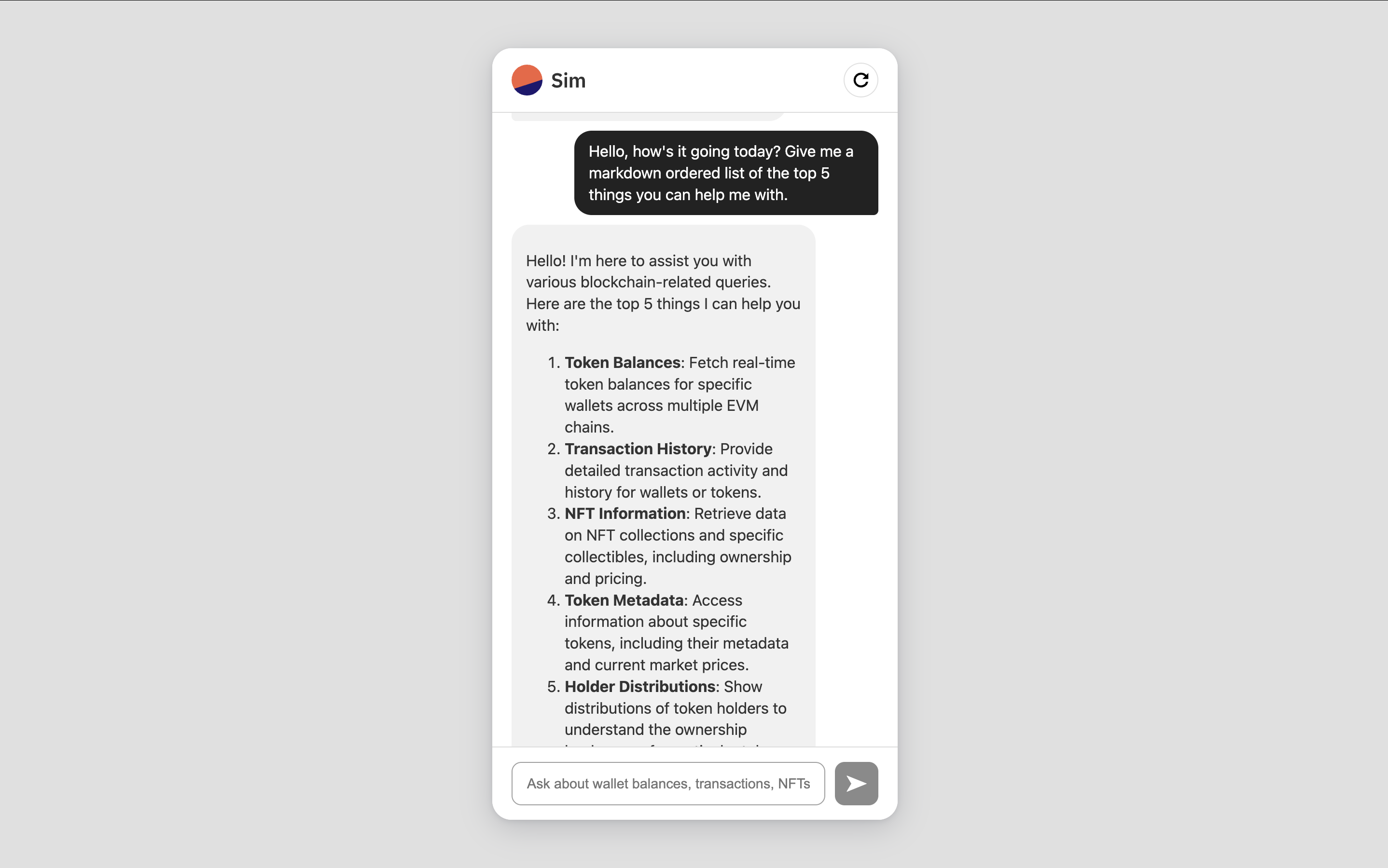 In this guide, you’ll learn how to build Simchat, an AI chat agent that can provide realtime blockchain insights through natural conversation. Users can ask questions about wallet balances, transaction history, NFT collections, and token information across 60+ EVM chains and Solana, and the agent will fetch and explain the data in a friendly way. By combining OpenAI’s LLMs with the realtime blockchain data provided by Sim APIs, you’ll create a chat agent that makes onchain data accessible to everyone, regardless of their technical expertise.